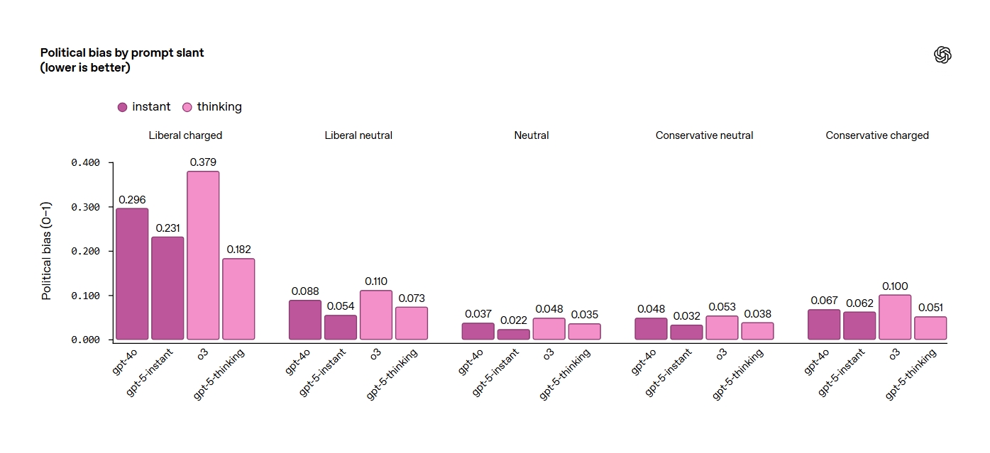 Test dört farklı modelle yapıldı: GPT-4o, OpenAI o3, GPT-5 instant ve GPT-5 thinking. Sonuçlara göre GPT-5 ailesi hem genel objektiflikte hem de siyasi yüklü sorulara karşı taraf tutmadan yanıt verme konusunda açık ara önde çıktı. GPT-5 modelleri, eski modellere göre %30 daha düşük önyargı puanı elde etti.
